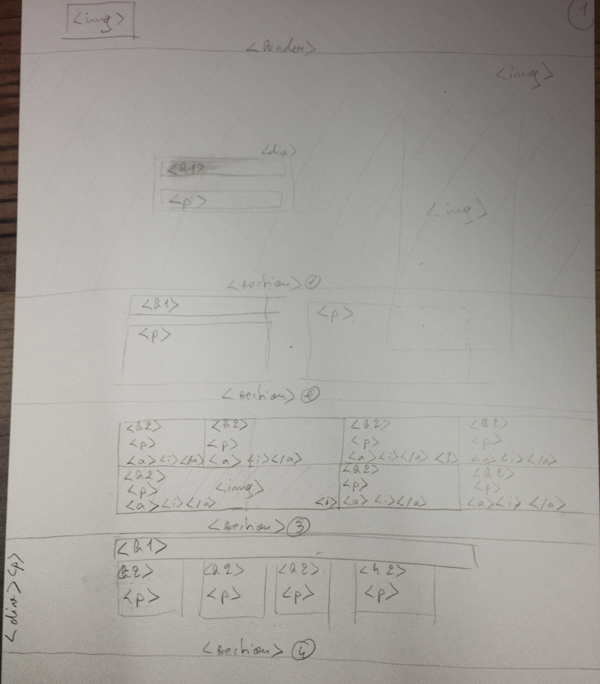 You can also started to distinguish different forms of content like text, images, gradients, and geometric forms. In general, it isn't a bad idea to write out the mockup elements that will be ultimately translated into HTML. Here is also a good place to add elements that don't necessarily show up in the mockup itself like a <ul> tag for lists or a form tag for forms.