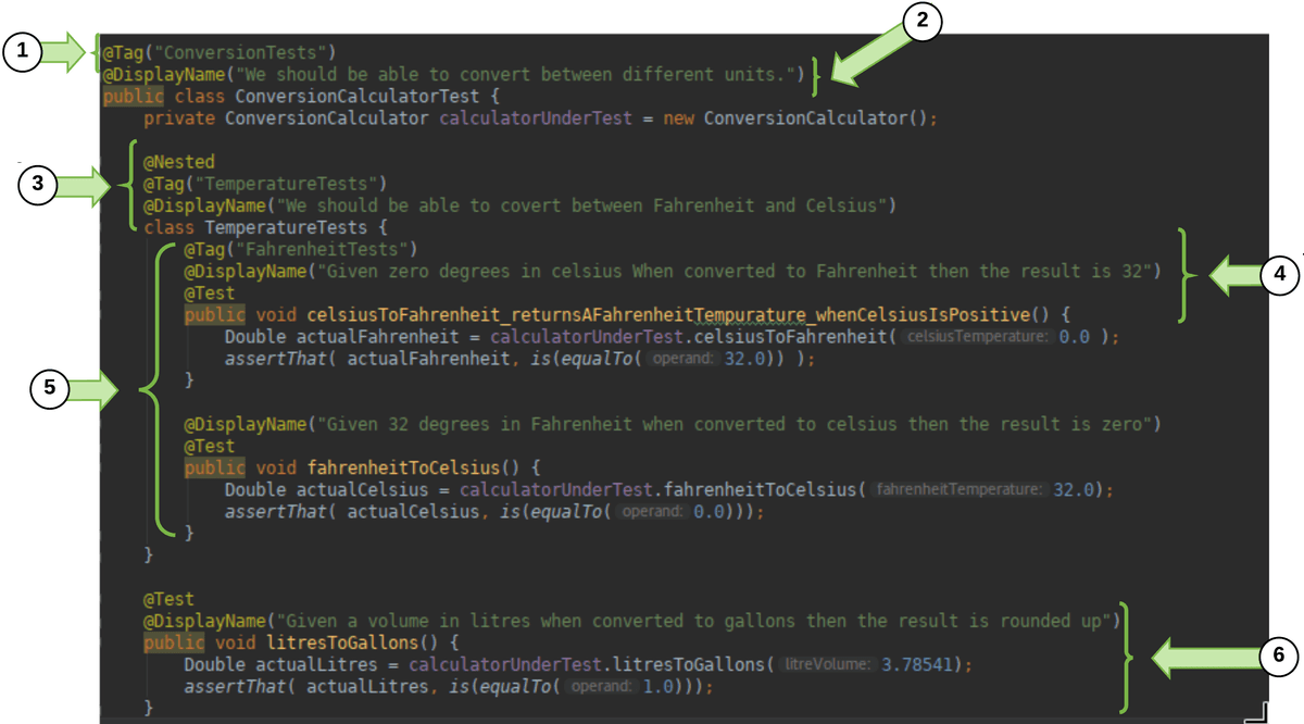 The method name should clearly describe what is being tested. It’s important to give your tests a name which describes what the test is checking for.