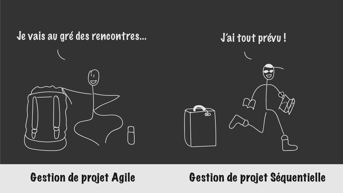 La gestion de projets informatique est assez semblable sauf qu’on va plutôt parler de méthodes séquentielles, avec lesquelles on prévoit tout tout depuis le début, ou de méthodes agiles, qui laissent le champ libre aux changements.