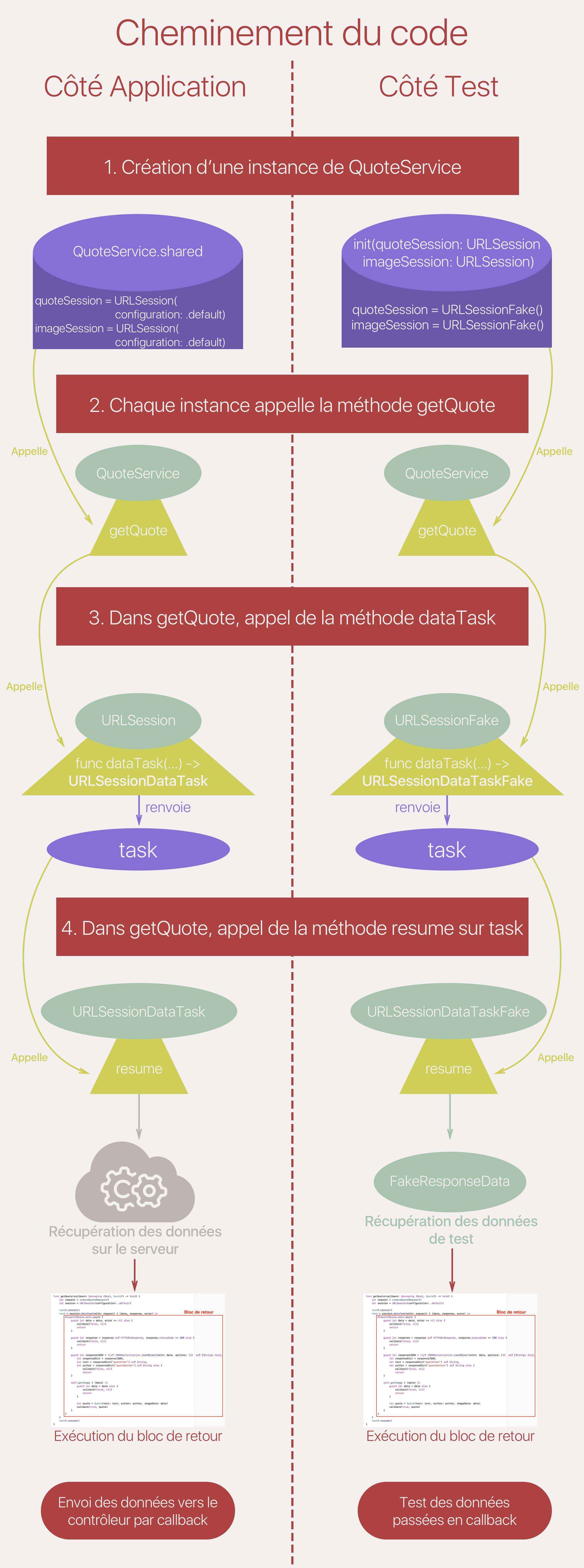 Illustration du cheminement du code côté application et côté test.