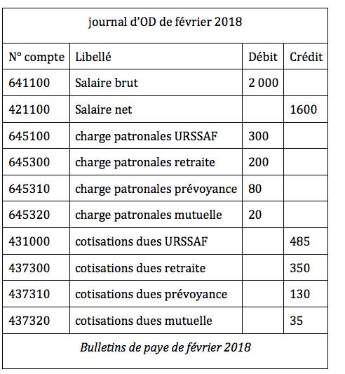 Par exemple, les bulletins de paye du mois de février 2018 seront saisis dans un journal d’opérations diverses de février 2018.