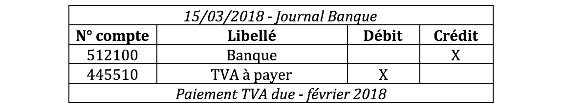 Bien entendu, si elle aboutit à un montant de TVA à payer, vous allez payer ce montant (au même moment que vous faites la déclaration de TVA). Vous aurez alors une deuxième écriture comptable à saisir, par un journal de trésorerie, au jour où vous faites le paiement (par exemple le 15/03/2018).