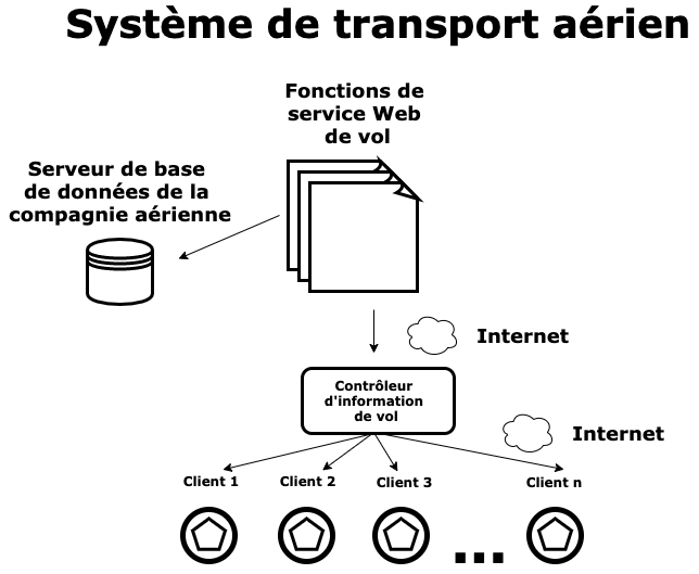 Informations sur les vols | Un service web d'information sur les vols accepte en entrée un numéro de vol. Il renvoie les données relatives au vol : heure de départ, heure d'arrivée prévue, lieu de départ, lieu d'arrivée, altitude actuelle, etc. |