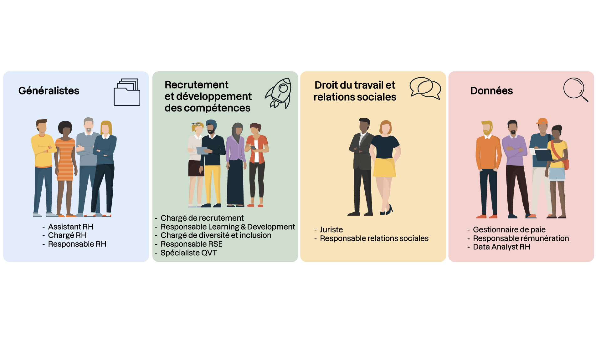 Pour mieux identifier les opportunités professionnelles en RH, distinguons les familles de métiers qui composent le secteur. On peut les répartir en 4 principales :
