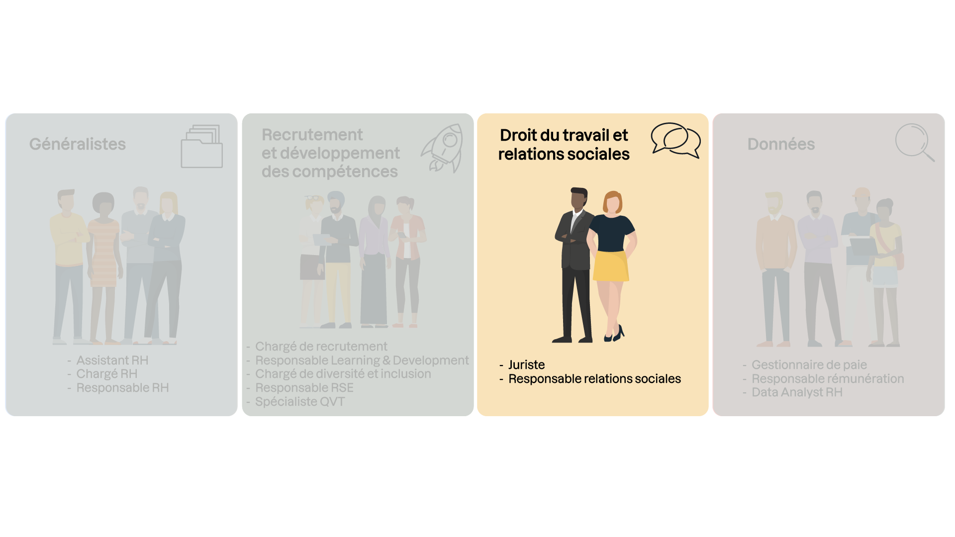 Concentrons-nous maintenant sur la troisième famille des métiers RH. Vous avez déjà entendu ou même collaboré avec les métiers de juriste en droit du travail et de responsable relations sociales ?